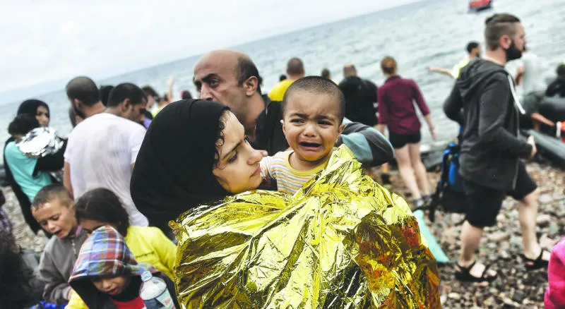 طفل سوري يبكي في حضن أمه بعد وصولهما، ومجموعة لاجئين سوريين، إلى جزيرة ليزبوس اليونانية أمس (أ. ف. ب)