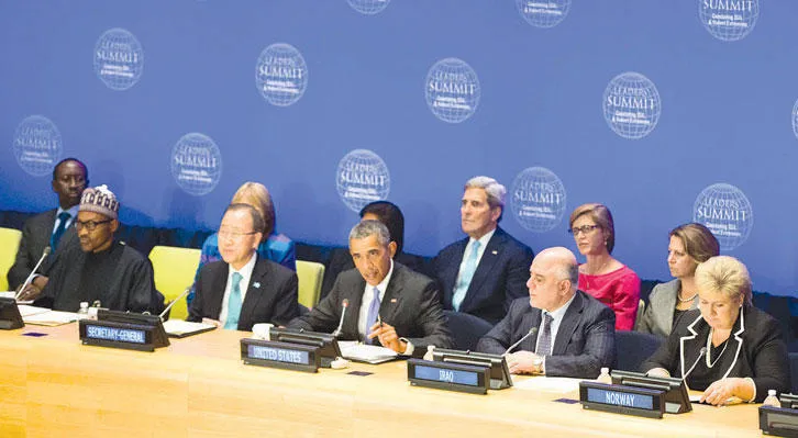 في افتتاح قمة مكافحة الإرهاب ويبدو الرئيس أوباما.. إلى اليسار الرئيس النيجيري والأمين العام للأمم المتحدة ورئيس وزراء العراق حيدر العبادي (أ.ب)