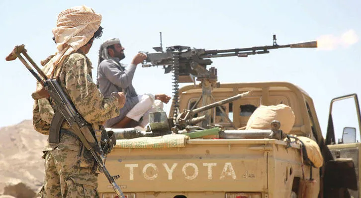 عناصر الجيش الوطني تطلق النار خلال مواجهات مع المتمردين في ضواحي سد مأرب أمس (أ.ف.ب)