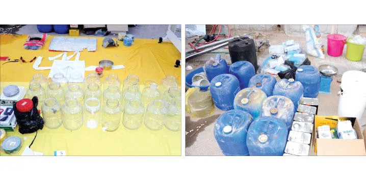 القناني والزجاجات التي تم ضبطها قبل إعدادها لتنفيذ العمليات الإرهابية (واس)