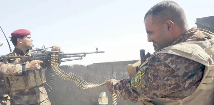 جنديان عراقيان خلال مواجهة مع تنظيم «داعش» قرب الكرمة شرق محافظة الأنبار (رويترز)