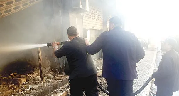 رجلا إطفاء لبنانيان يحاولان السيطرة على حريق شب في أحد المباني بعد مواجهات بين حزب الله ومسلحين في بعلبك أمس (أ.ف.ب)