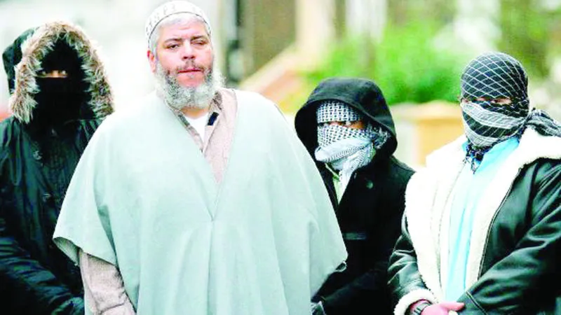 أبو حمزة أثناء وجوده في بريطانيا بين مؤيديه قبل اعتقاله وترحيله إلى أميركا