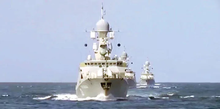 صورة منقولة عن موقع وزارة الدفاع الروسية لبوارج حربية في بحر قزوين أُطلقت منها الصواريخ التي استهدفت «داعش» في سوريا (إ.ب.أ)