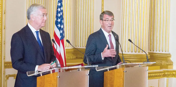 وزيرا الدفاع الأميركي آشتون كارتر والبريطاني مايكل فالون في مؤتمر صحافي في لندن أمس (تصوير: جيمس حنا)