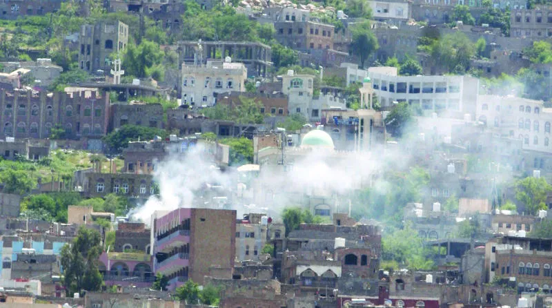 سحب الدخان تتصاعد من موقع عسكري للحوثيين إثر إطلاق قذيفة هاون خلال اشتباكات بين المتمردين ومقاتلين من لجان المقاومة الشعبية جرت في تعز أمس (رويترز)