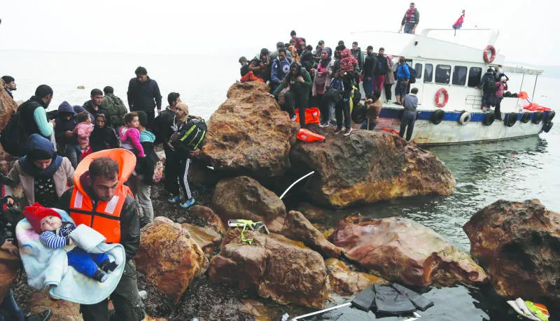 مهاجرون عند وصولهم إلى جزيرة ليسبوس اليونانية على متن قارب صيد مكتظ أمس (إ.ب.أ)