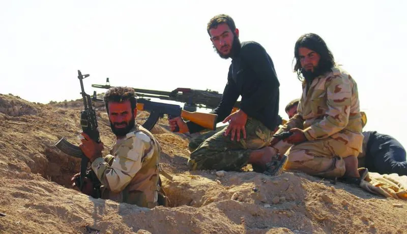 مقاتلو المعارضة يتخذون وضع الاستعداد للتصدي لهجوم قوات النظام السوري في كفر نبودة بريف حماه وسط البلاد، أمس (رويترز)