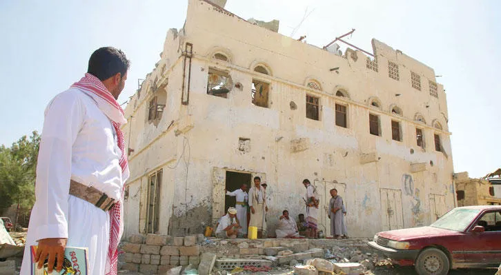 يمنيون بجوار مبنى مدمر جراء اشتباكات بين مقاتلين من لجان المقاومة الشعبية الموالية للشرعية والمتمردين الحوثيين في قرية الفاو قرب محافظة مأرب، شرق العاصمة صنعاء (أ.ف.ب)
