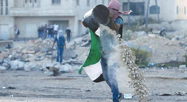 فلسطيني يفرغ سطلاً من الحجارة بهدف استخدامها في مواجهة القوات الإسرائيلية في رام الله أمس (رويترز)