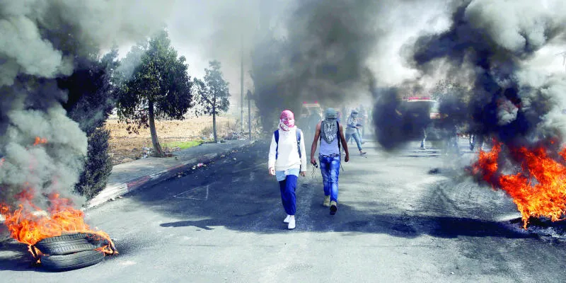 شبان فلسطينيون يمشون وسط إطارات مشتعلة خلال مواجهات مع قوات الاحتلال قرب مستوطنة بيت إيل على أطراف رام الله بالضفة الغربية أمس (أ.ف.ب)