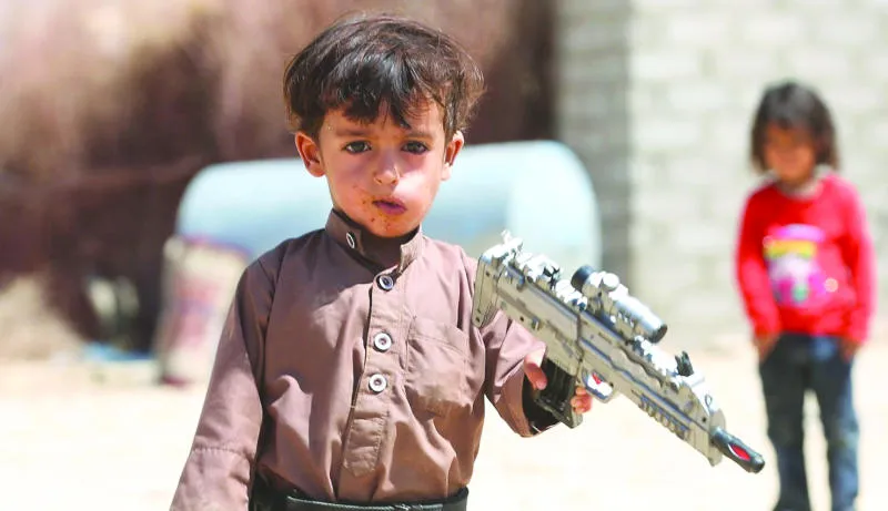 طفل يمني يحمل بندقية لعبة في مخيم للنازحين الذين أجبروا على مغادرة منازلهم بسبب العنف الحوثي في مأرب المحررة (رويترز)