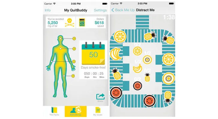 أما إن كنت تبحث عن وسيلة تساعدك على الإقلاع عن التدخين، فسيعجبك تطبيق «ماي كويت بادي» My QuitBuddy المجاني في متاجر «آي تونز» و«آندرويد» و«ويندوز»، والذي طورته وكالة الصحة الوقائية الوطنية الأسترالية، والذي يتأكد من أن المستخدم ملتزم ببرنامج الإقلاع عن التدخين، مع ربط المستخدم بمجتمع رقمي يشجع أفراده بعضهم بعضا بنصائح لتشتيت الرغبة بالتدخين ويشاركون سعادة من نجح بالإقلاع وانعكاس ذلك عليه في جميع النواحي. ويعرض التطبيق كذلك رسائل تنبيهية للمستخدم تتوقع اقتراب شعوره بالرغبة بالتدخين، ليشغل التطبيق لعبة لتشتيت انتباه المستخدم عن تلك الرغبة، أو تحويله إلى غرف الدردشة مع الآخرين لنسيانها.