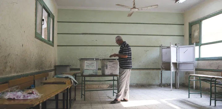 مواطن مصري يدلي بصوته في لجنة انتخابية تعاني من قلة الحضور في محافظة الجيزة أمس (رويترز)