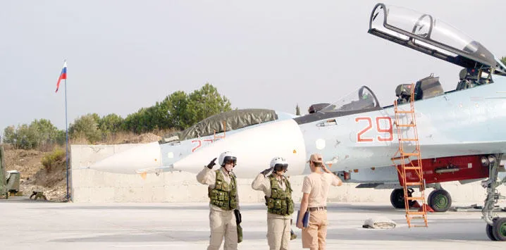 الطاقم الأرضي الروسي في مطار القاعدة الجوية حميميم بسوريا يشير إلى الطيارين بأن الطائرة الخاصة جاهزة للإقلاع في مهمة قتالية أمس (أ.ب)