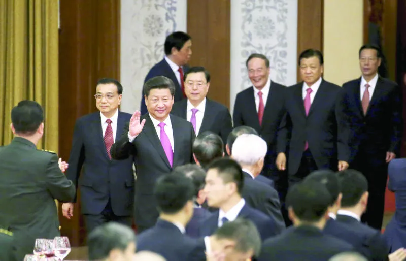 الرئيس الصيني شي جينبينغ مع عدد من أعضاء الحزب الشيوعي الحاكم خلال ترؤسه مراسم الاحتفال باليوم الوطني للصين في بكين (رويترز)