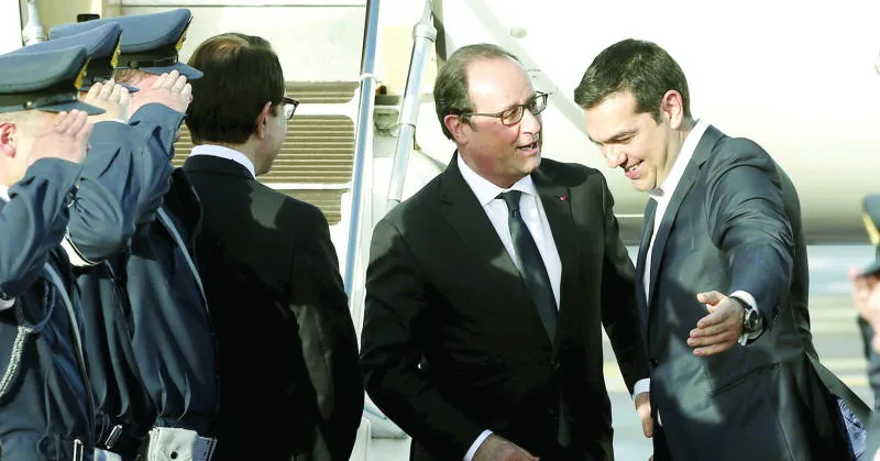 ألكسيس تسيبراس مستقبلاً هولاند في أثينا أمس (رويترز)