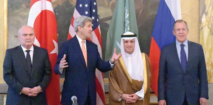 وصل الدفع الروسي نحو «الحل السياسي» إلى ذروته، أمس، مع الاجتماع الرباعي في فيينا، بمشاركة وزراء خارجية روسيا والولايات المتحدة والسعودية وتركيا، الذي عرض فيه الروس خطة الحل الذي يقترحونه مخرجًا للأزمة السورية المستمرة منذ أكثر من 4 سنوات.