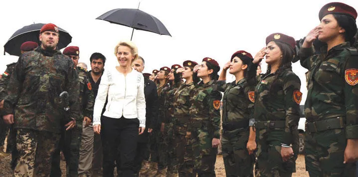 وزيرة الدفاع الألمانية تمر أمام فوج من مجندات البيشمركة بأربيل أمس (أ.ف.ب)
