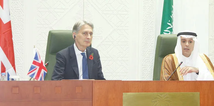 عادل الجبير خلال مؤتمر صحافي في الرياض أمس جمعه مع نظيره فيليب هاموند وزير الخارجية البريطاني (تصوير: إقبال حسين)