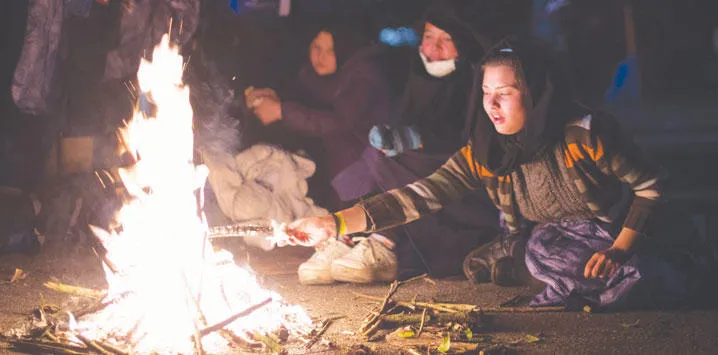 مهاجرات يشعلن النار بالقرب من مدينة باساو الألمانية، أول من أمس، بانتظار الحافلات التي ستنقل طالبي اللجوء إلى الملاجئ المعدة لهم رسميًا (أ.ب)