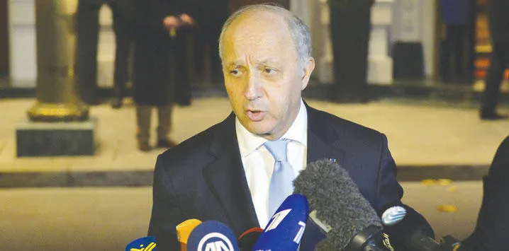 وزير الخارجية الفرنسية لوران فابيوس يتحدث للصحافيين أمس (أ.ف.ب)