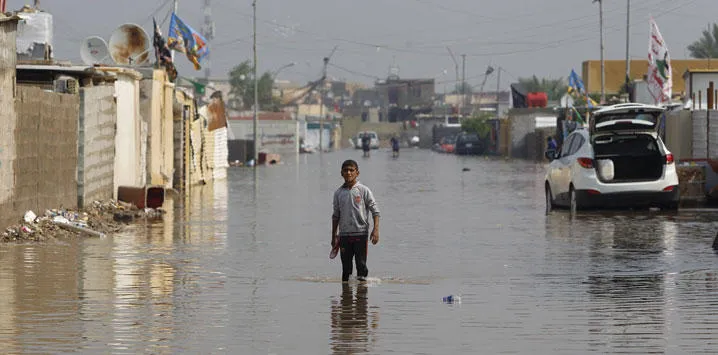 صبي يقف وسط شارع تغمره مياه الأمطار في بغداد أمس (رويترز)
