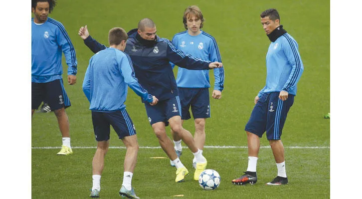 بيبي مدافع الريـال يستعرض بالكرة بين كريستيانو رونالدو ومودريتش ومارسيلو في تدريبات أمس (إ.ب.أ)