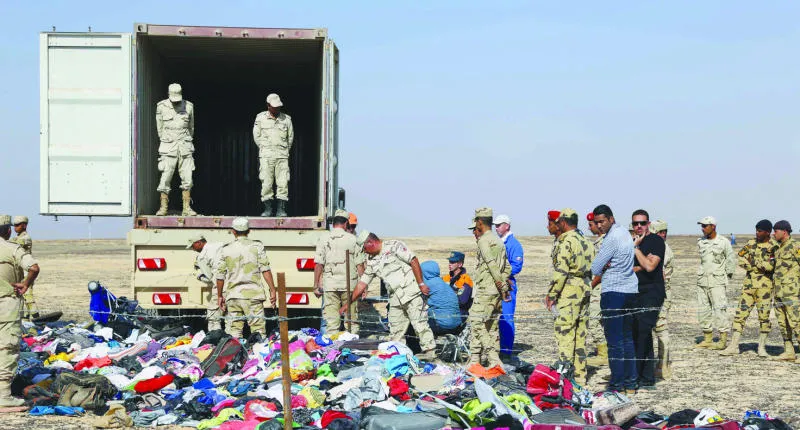 مسؤولون مصريون وروس يتفقدون ما تبقى من حقائب ضحايا الطائرة الروسية التي سقطت بالقرب من مدينة العريش (أ.ف.ب)