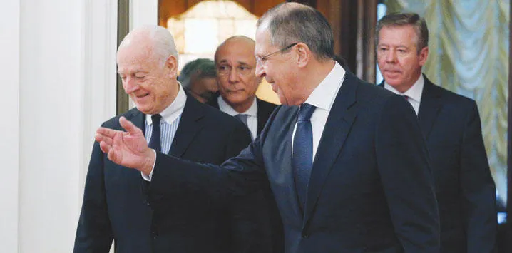 لافروف يتحدث إلى دي ميستورا لدى وصولهما لعقد مؤتمر صحافي في موسكو أمس (إ.ب.أ)
