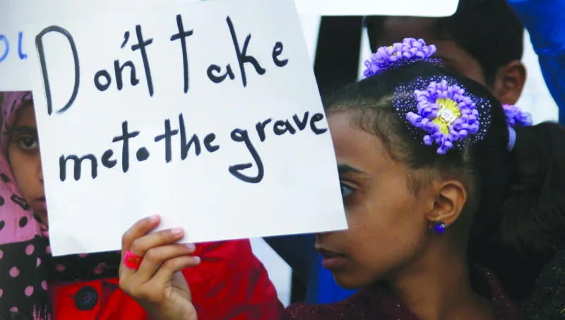 فتاة تحمل لافتة تقول «لا تأخذني إلى القبر» خلال مظاهرة احتجاج في تعز ضد الحصار المفروض على المدينة (رويترز)