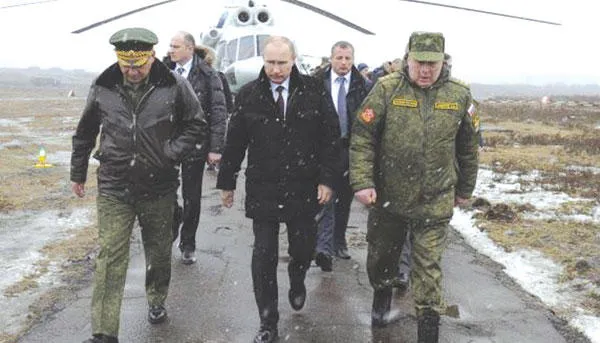 الرئيس الروسي فلاديمير بوتين بصحبة وزير دفاعه وقادة عسكريين لدى وصولهم إلى قاعدة روسية في إقليم لينينغراد أمس (إ.ب.أ)