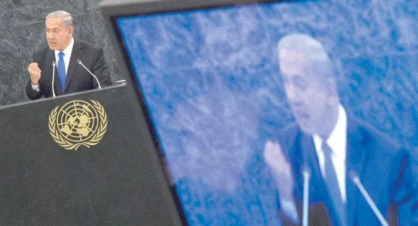 رئيس الوزراء الإسرائيلي بنيامين نتنياهو خلال إلقائه خطاب إسرائيل  أمام الجمعية العامة للأمم المتحدة في نيويورك أمس (رويترز)