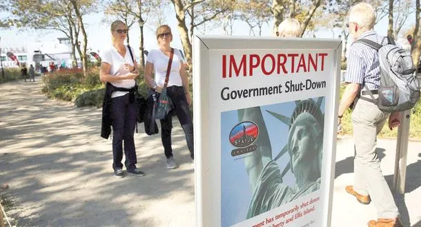 أميركيتان تطالعان إعلانا عن إغلاق مقر تمثال الحرية في نيويورك بسبب الإقفال الجزئي لدوائر الحكومة الفيدرالية أمس (أ.ف.ب)
