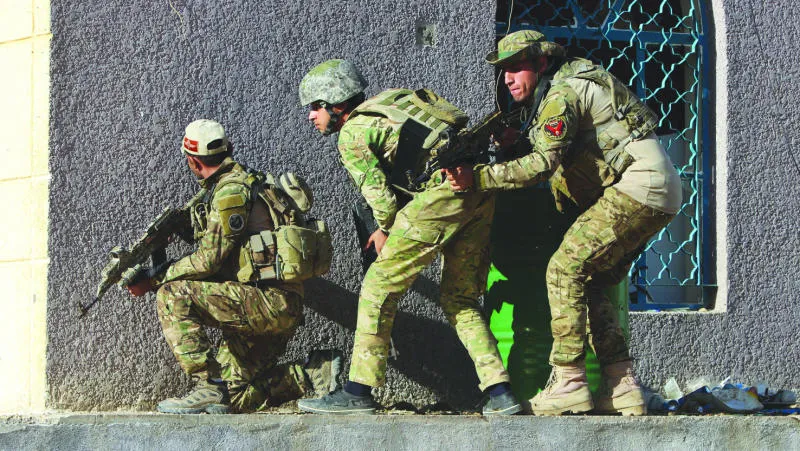 جنود عراقيون خلال مواجهة مع مسلحي «داعش» في قرية السجارية قرب الرمادي أمس (إ.ب.أ)
