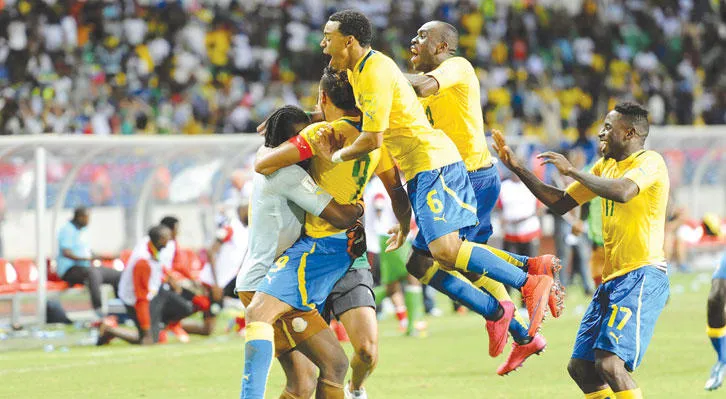 لاعبو الغابون يحتفلون بالتأهل إلى الدور الثالث من تصفيات المونديال على حساب موزمبيق (أ.ف.ب)