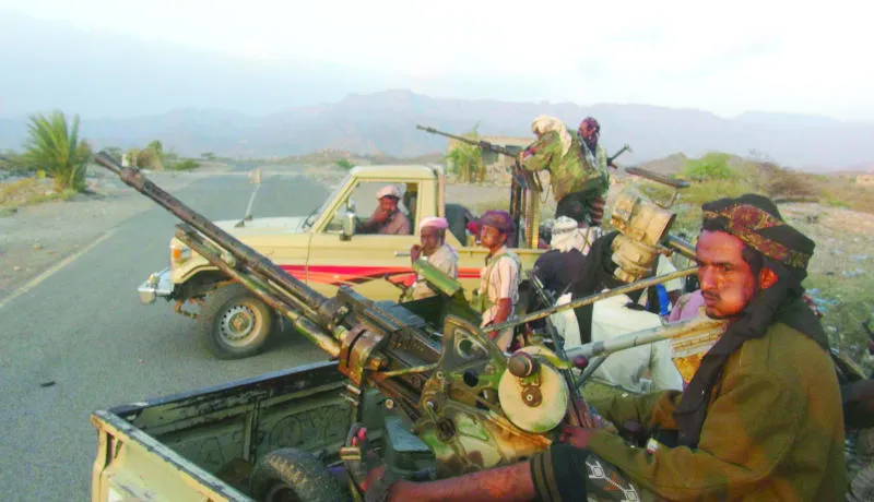 مسلحون من رجال القبائل اليمنية ولجان المقاومة الشعبية يتجهون بشاحنة نحو إحدى جبهات القتال ضد الانقلاب الحوثي في تعز (أ.ف.ب)