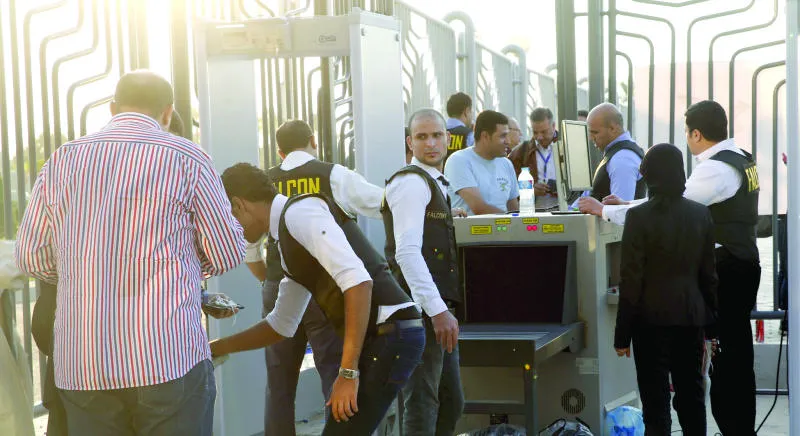 أفراد إحدى شركات الأمن الخاصة يفتشون المشجعين في استاد برج العرب العسكري في الاسكندرية قبل بدء مباراة مصر أمام تشاد في التصفيات المؤهلة لنهائيات كأس العالم (رويترز)