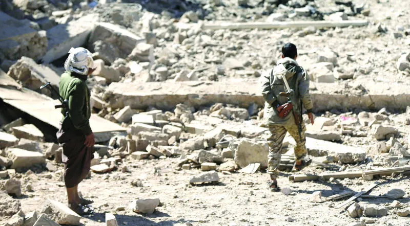عنصران من ميليشيات الحوثيين يحرسان ساحة داخل صنعاء (رويترز)