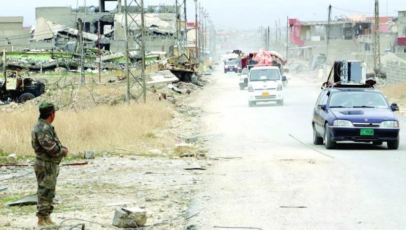مقاتل من البيشمركة يراقب سيارات مواطنين يعودون قبل أيام إلى بيوتهم في سنجار بعد تحريرها من «داعش» (رويترز)