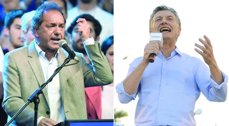 صورة لموريسيو ماكري ودانيال سيولي المتنافسين على الانتخابات الرئاسية التي تنطلق اليوم في الأرجنتين (أ.ف.ب)