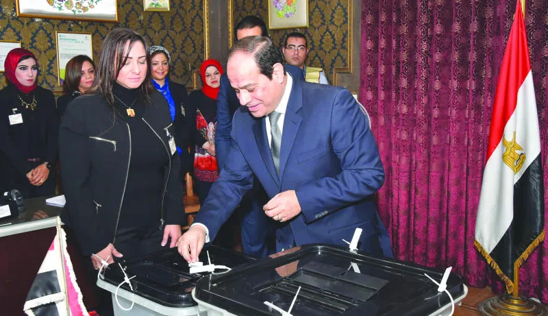 الرئيس المصري عبد الفتاح السيسي أدلى بصوته أمس في انتخابات مجلس النواب للمرة الأولى بلجنة في مدرسة بمصر الجديدة (شرق القاهرة) (أ.ف.ب)