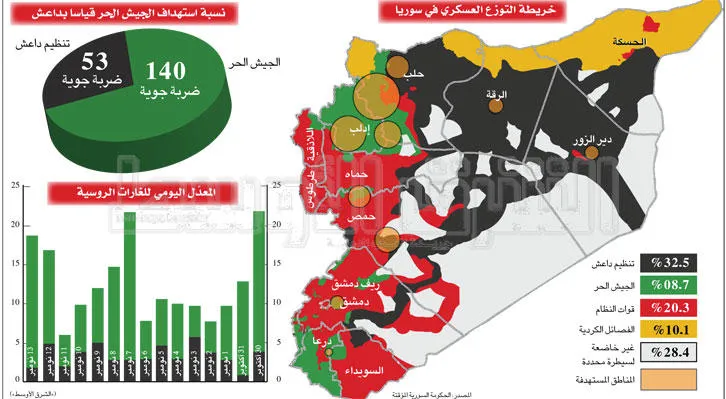 وترى المعارضة السورية في التركيز الذي يوليه النظام السوري وحلفاؤه، لمعركة «تحجيم» الجيش السوري الحر وحلفائه، محاولة تصب في الاتجاه نفسه، مشيرة إلى أن الثقل الروسي الكبير في الميدان يحاول حصر الحر وحلفائه في إدلب وريف حماه وبعض ريف حلب. وتوضح خارطة أعدتها الحكومة المؤقتة السورية التي أنشأها الائتلاف السوري المعارض، خريطة توزع القوى على الأرض، بما يجعل من تنظيم داعش المسيطر الأول في الأرض السورية بـ32.5 في المائة، يليه «الفراغ» حيث لا تتبع الأرض لأي فصيل محدد، وهي المناطق غير المأهولة من الصحاري والغابات، بنسبة 28.4 في المائة، ثم القوات النظامية السورية بـ20.3 في المائة فالأكراد بـ10.1 في المائة، وأخيرا الجيش الحر والتنظيمات الأخرى - بما فيها جبهة النصرة – بـ8.7 في المائة.