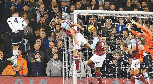 الدرفيريلد (يسار) يسجل هدف توتنهام الثاني في مرمى وستهام بضربة رأسية (أ.ب)