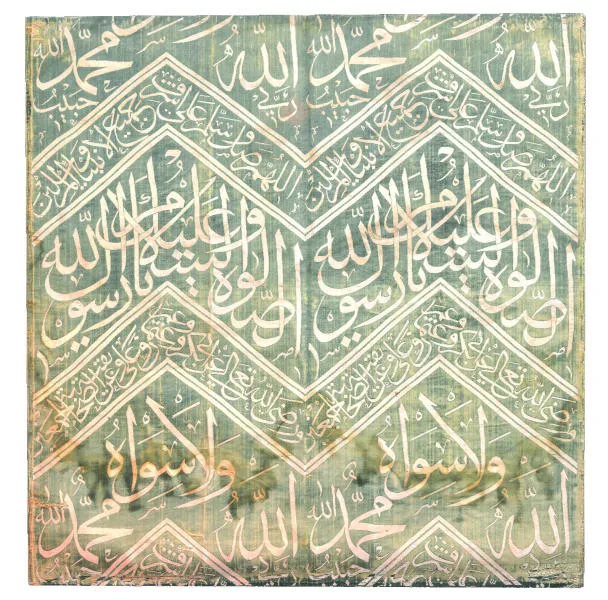 ربما كانت مثل هذه الستائر مخصصة لمحراب الصلاة في مسجد النبي محمد عليه الصلاة والسلام، حيث تتضمن النماذج السابقة من هذا النوع نقشا مكتوبا فيه: «هذا هو محراب النبي صلى الله عليه وسلم». وتتضمن هذه الستارة الشهادتين ودعاء إلى الله «يا فتاح» وجزءا من الآية 197 في السورة الثانية من القرآن الكريم، «البقرة». قال تعالى: «... وتزودوا فإن خير الزاد التقوى».