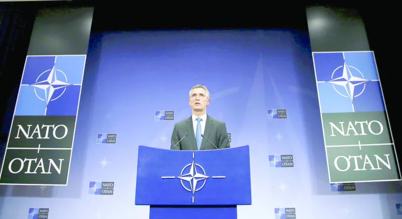 الأمين العام لحلف «الناتو» ينس ستولتنبرغ يتحدث في مؤتمر صحافي بمقر الحلف في بروكسل بعد اجتماعه الطارئ أمس (رويترز)