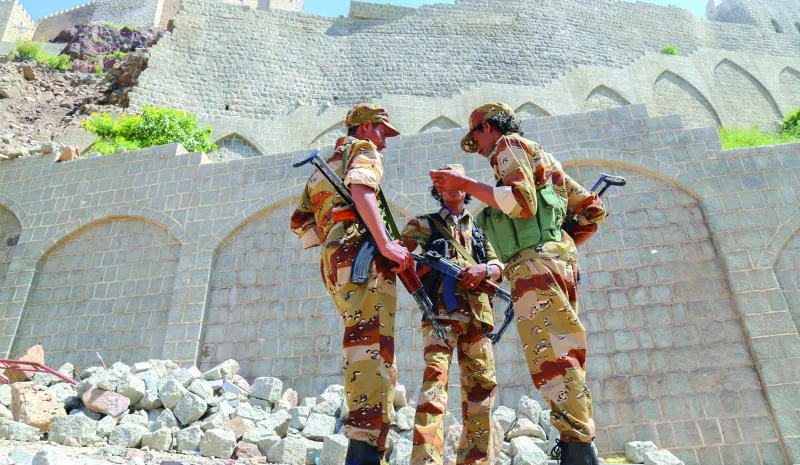 مقاتلون موالون للرئيس هادي يقفون أمام قلعة القاهرة في مدينة تعز (أ. ف. ب)
