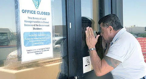 أميركي ينظر عبر نافذة مكتب للبريد جرى إغلاقه بسبب شلل الميزانية في مدينة لاس كروسيس بولاية نيو مكسيكو أمس (أ.ب)