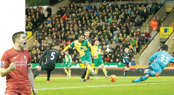 غرابان لاعب نوريتش يسدد في شباك حارس آرسنال التشيكي بيتر تشيك (رويترز) - ميلنر يحتفل بهدفه الذي أهدى الفوز لليفربول (أ.ف.ب)
