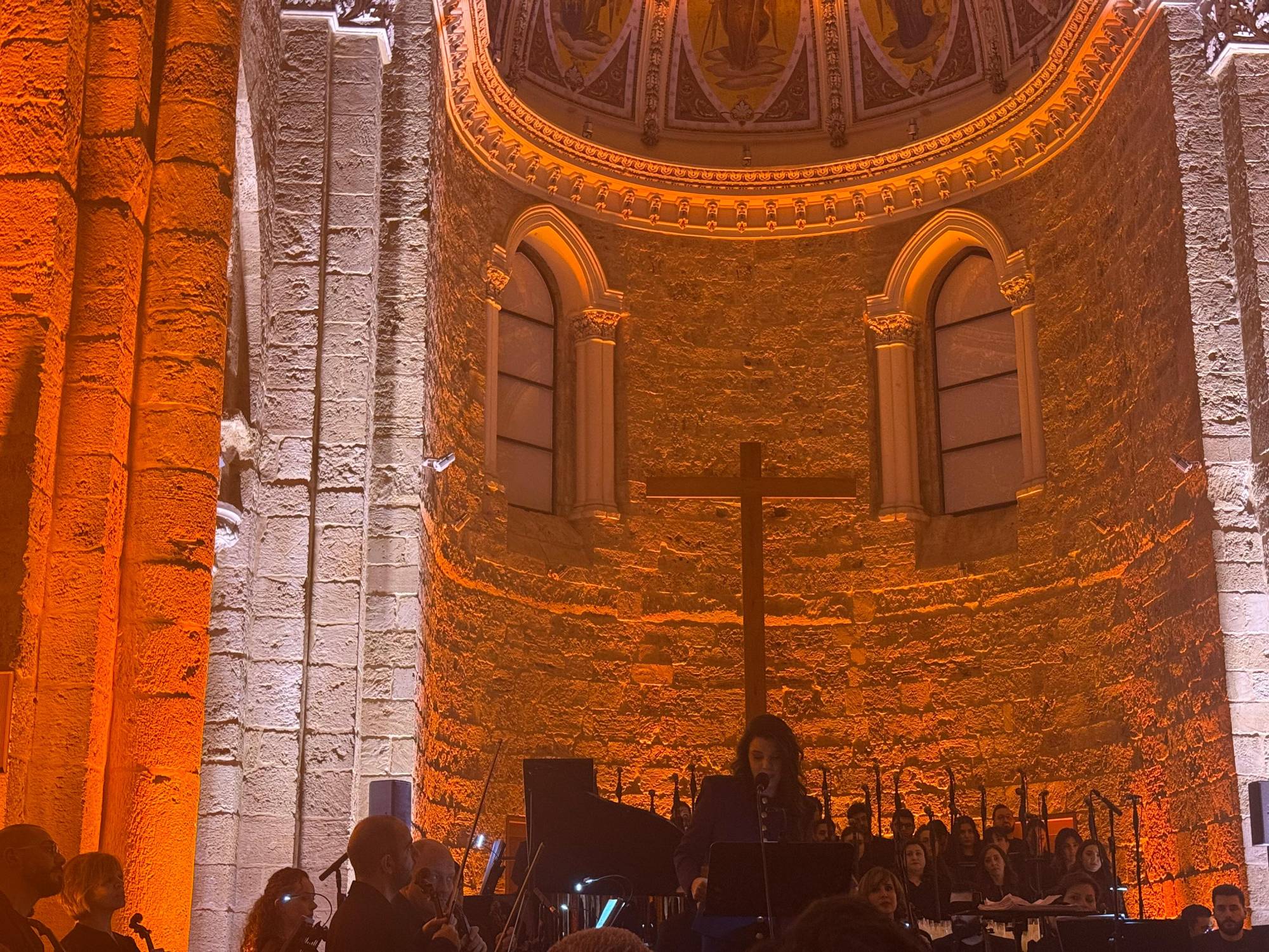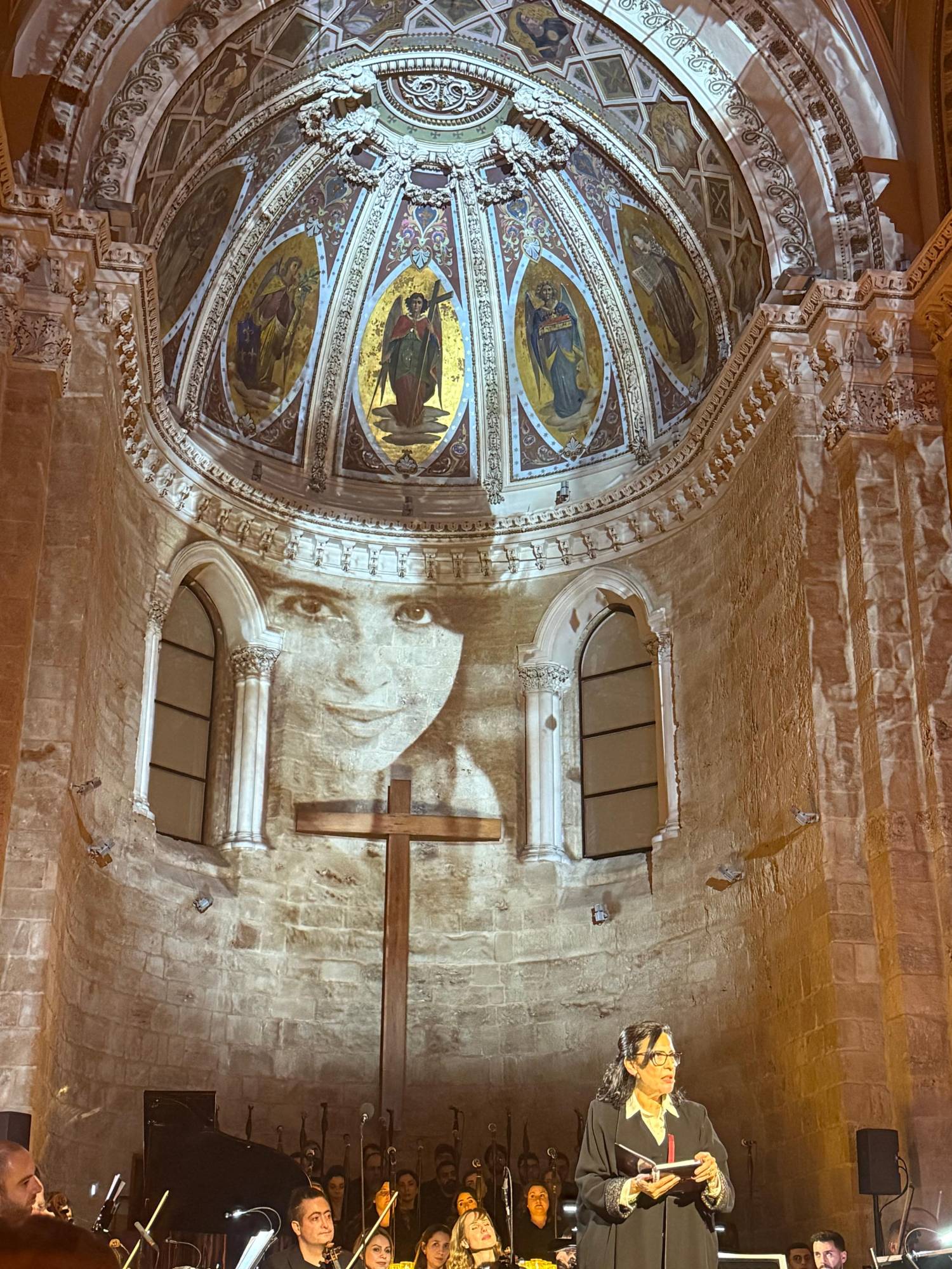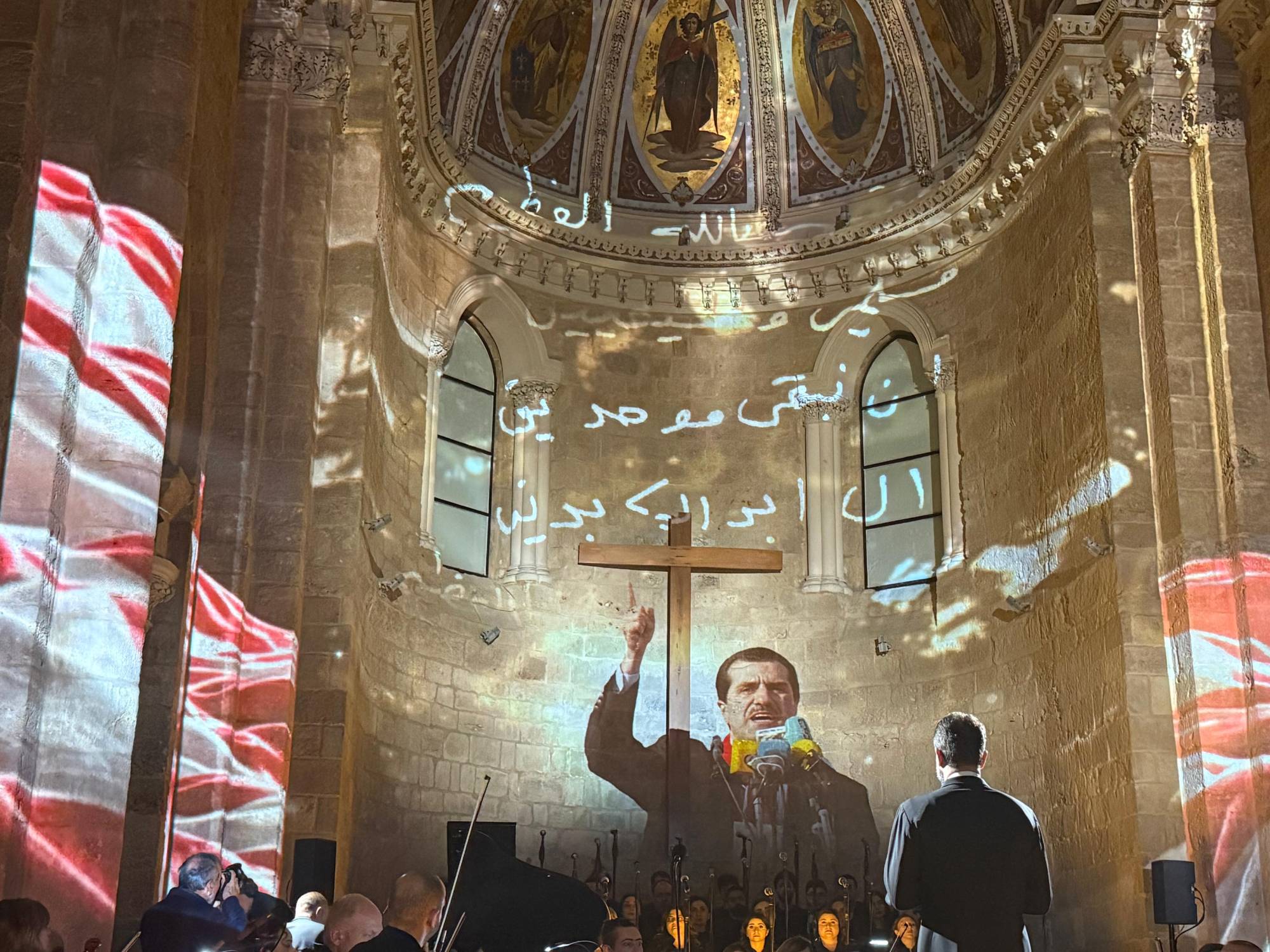 ثم سلَّم المايسترو لبنان بعلبكي الأمسية للموسيقى. جوقة جامعة «سيدة اللويزة»، التي يرأسها الأب خليل رحمة، وقفت خلف الأوركسترا، فيما الإضاءة تتبدَّل على الحجارة. تردَّد صوت جبران في الكنيسة... أحاديثه عن الحرّية، «قَسَمه» الشهير، لقطاته، ثم قراءة قصائد ناديا تويني بصوت جوليا قصّار. كانت نصوص الأم التي فقدت عائلتها تُقرأ فوق جدران شهدت تاريخاً آخر. الكلمات التي كتبتها عن الموت والوطن شكَّلت تذكيراً بأنّ اللغة أحياناً هي السلاح الوحيد المُتاح.